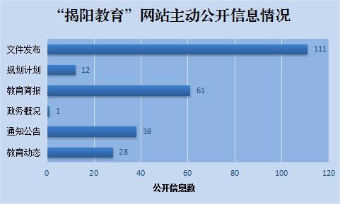 2017年,揭阳市教育局通过政府门户网站主动公开政府信息共251条,其中:“文件发布”111条,“规划计划”12条,“教育简报”61条,“政务概况”1条,“教育动态”28条,“通知公告”38条。